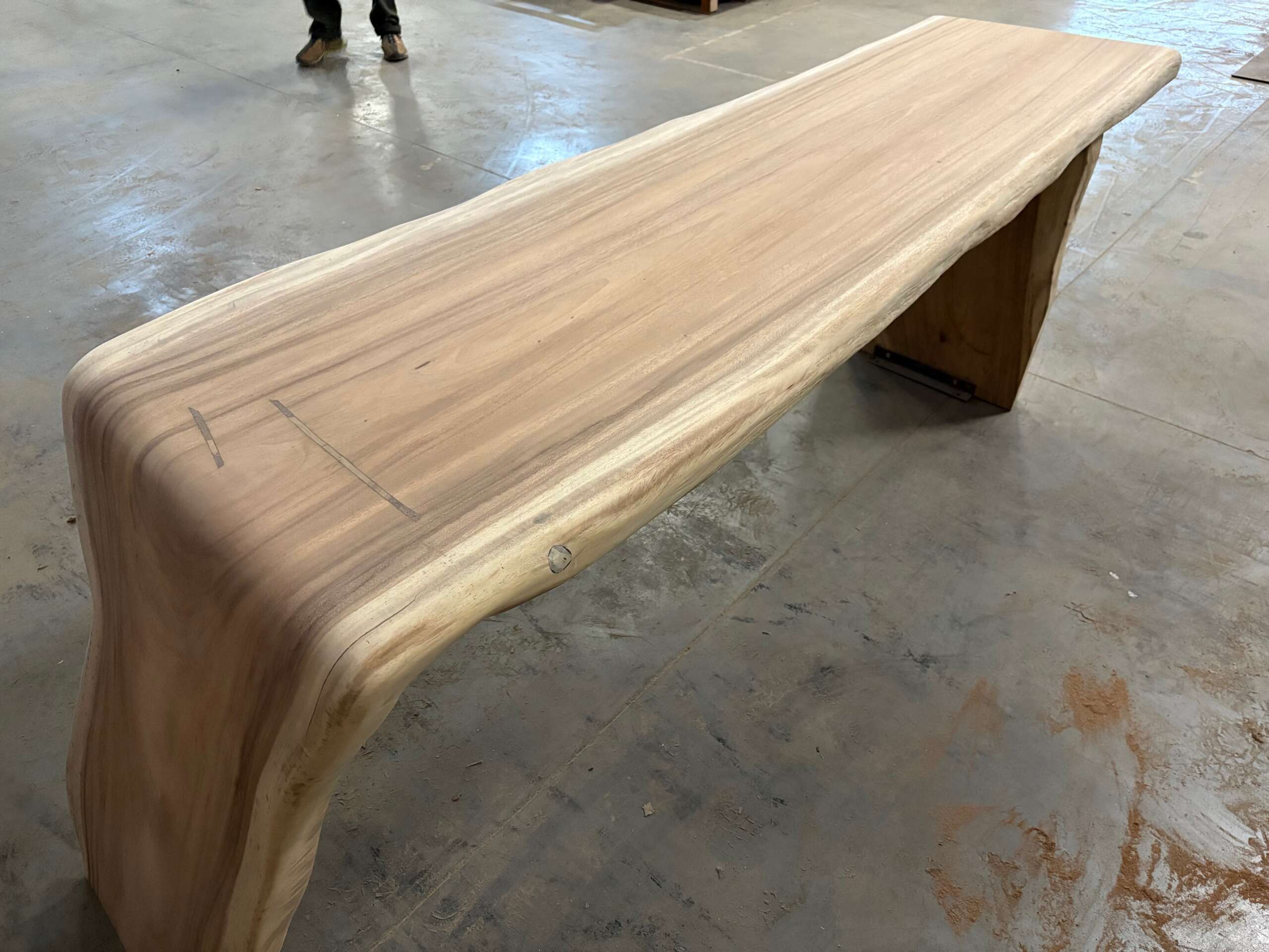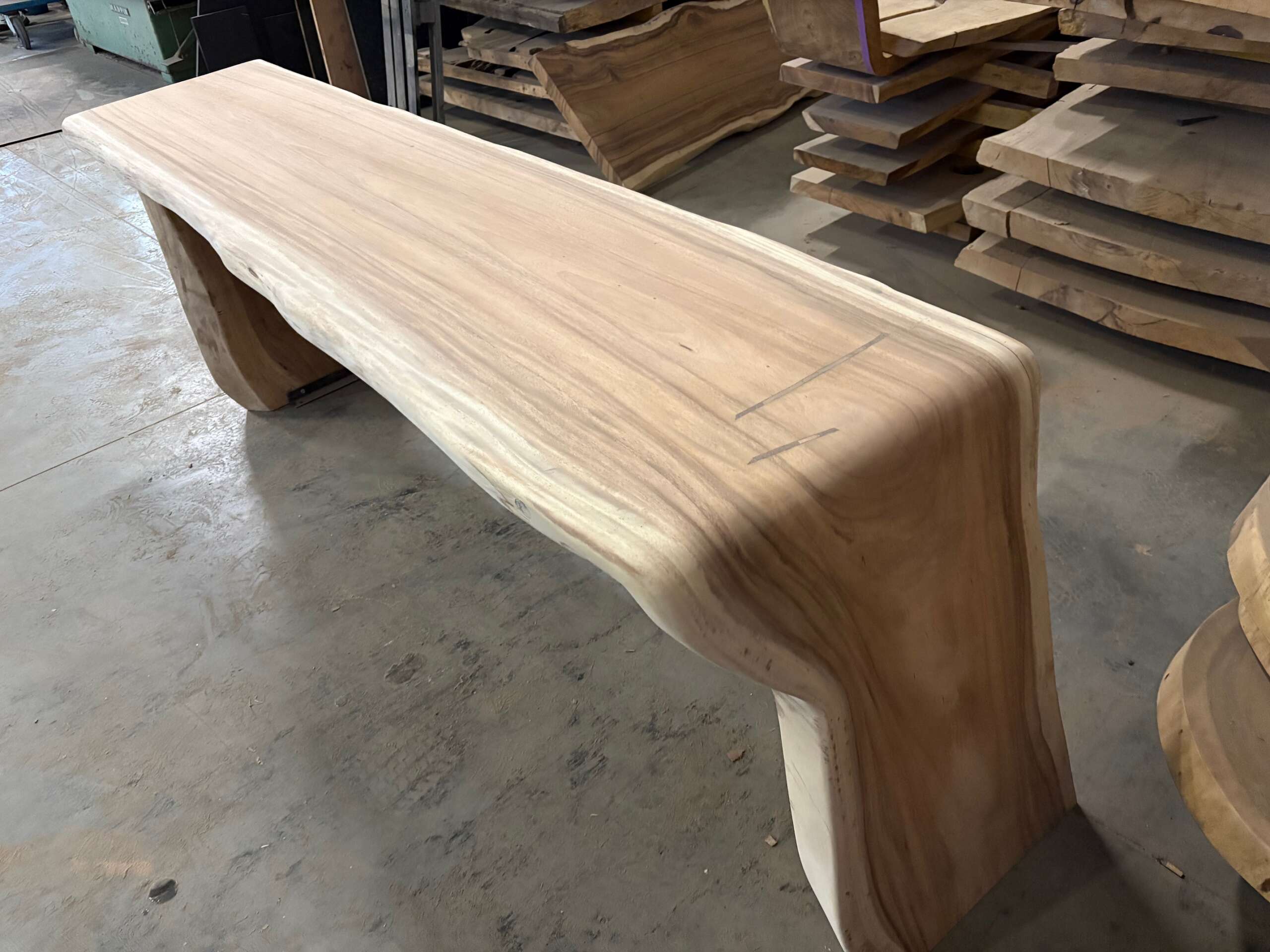 Le choix s’est porté sur un plateau curve en suar, directement tronçonné dans l’arbre, afin de conserver son arrondi naturel et sa présence brute. Une matière expressive, dont la forme guide naturellement le design.