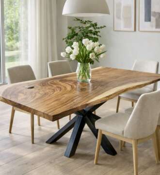 Matériau : Suar massif — bois exotique reconnu pour sa durabilité et ses veinages expressifs