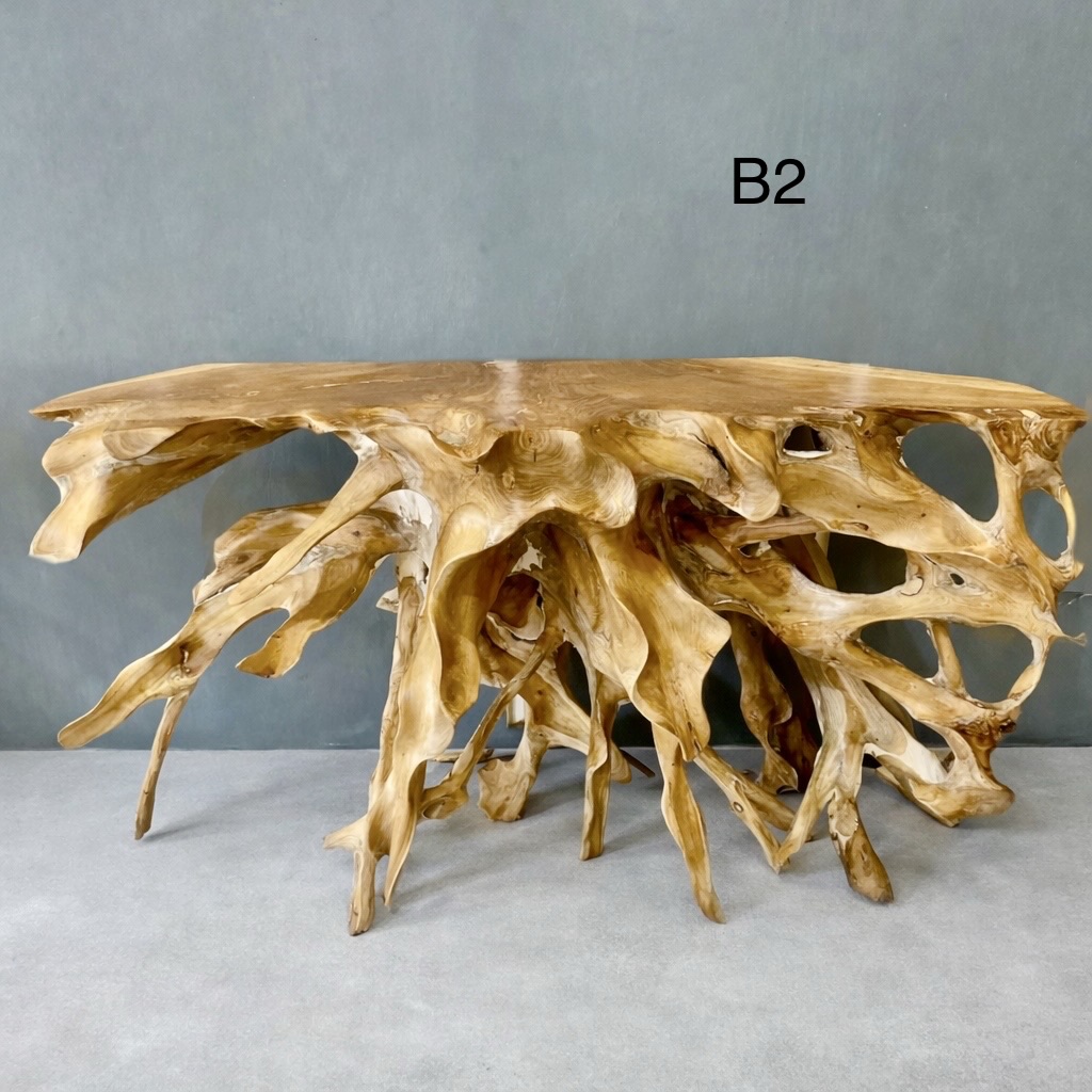 La console B2 en teck massif est sculptée dans une racine naturelle, révélant des lignes organiques uniques et une structure brute spectaculaire. Chaque modèle est une pièce artisanale singulière, conçue pour apporter une dimension authentique et haut de gamme à un intérieur.
