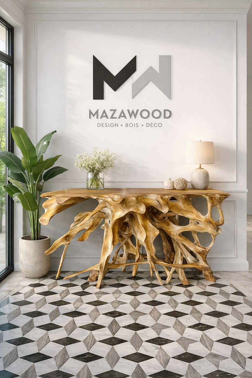 Son plateau finement travaillé contraste avec la base racinaire conservée dans son état naturel, créant un meuble design durable, idéal pour une entrée, un salon ou un espace professionnel.