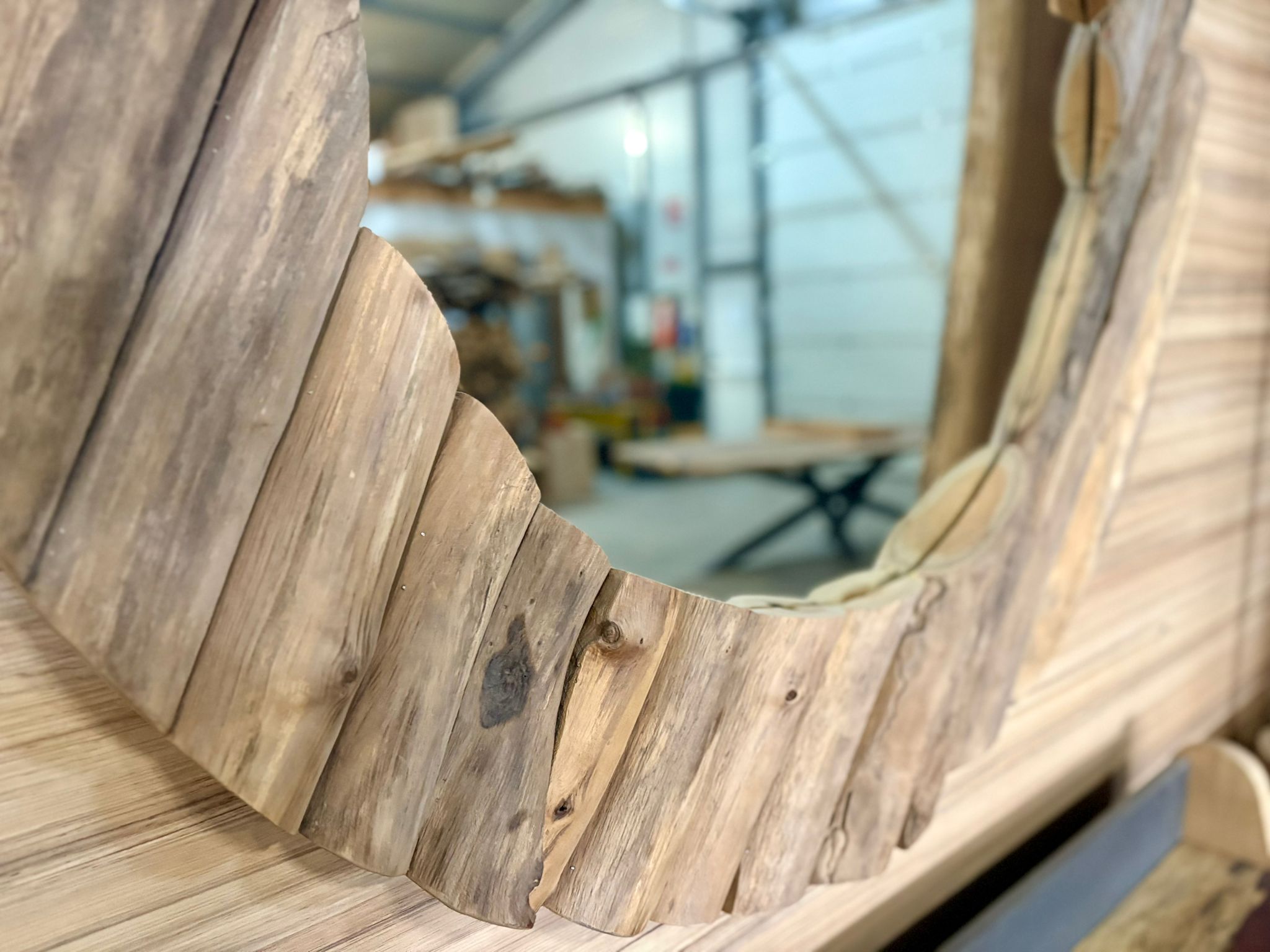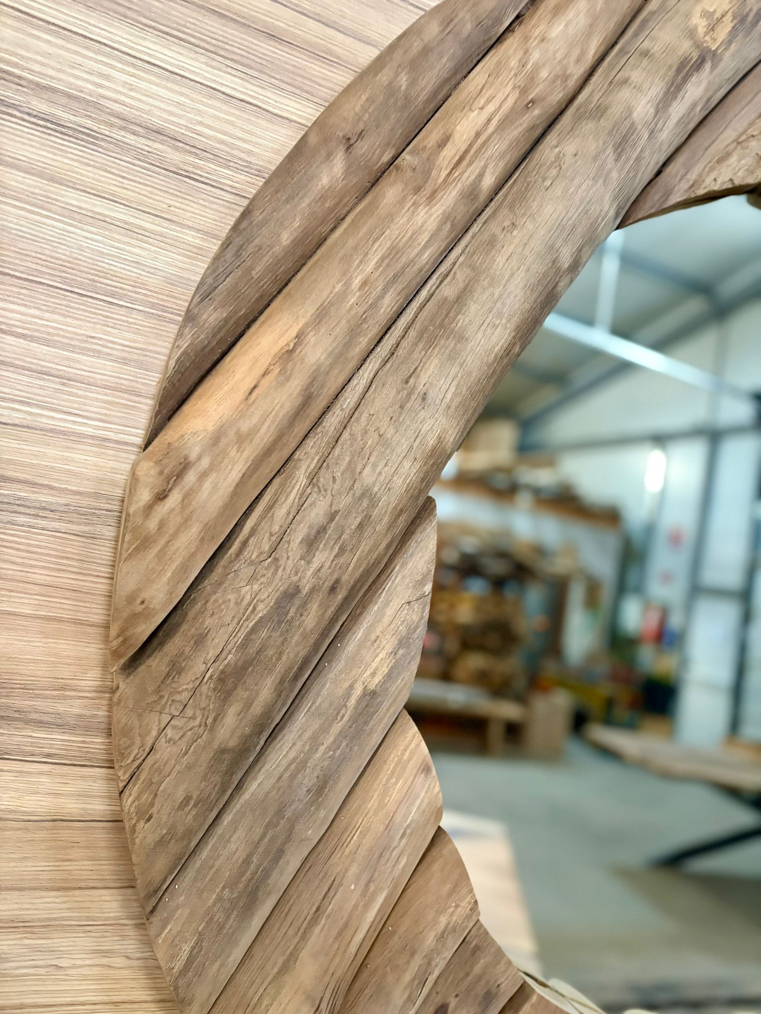 Authenticité : Chaque miroir est unique, avec ses marques du temps, variations de teintes et singularités naturelles du teck