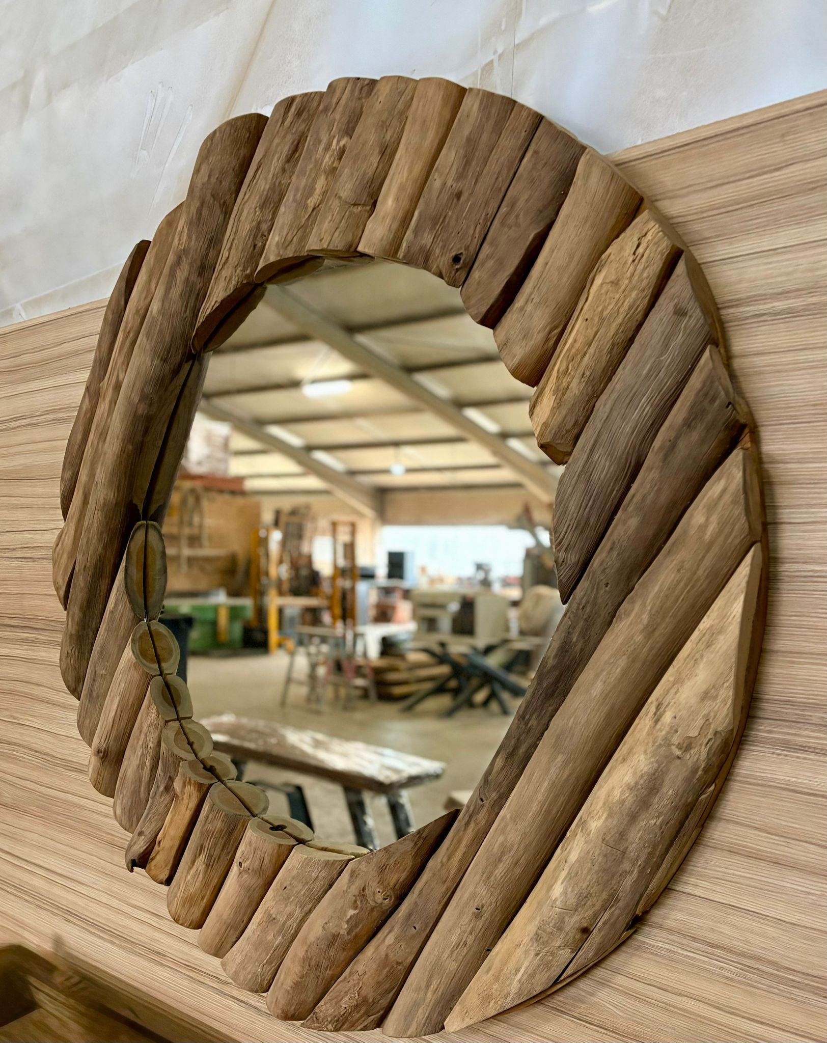 Ce miroir en teck massif se distingue par son caractère authentique et sa présence décorative forte. Son large diamètre de 120 cm en fait une pièce maîtresse idéale pour structurer un espace et apporter profondeur et luminosité à un intérieur.
