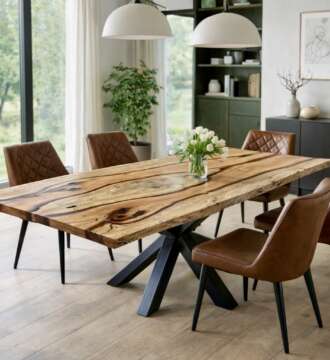 Appelé Albizia Saman, arbre de pluie, monkey pod ou rain tree en fonction des régions, le suar est un arbre formidable à plus d’un titre. L’arbre de pluie a une taille de géant, il peut atteindre une hauteur de 30 à 40 mètres, et sa cime une circonférence de 40 à 60 mètres. L’herbe est plus verte sous ce géant qu’ailleurs, car ses feuilles abritent du soleil mais se rétractent quand la luminosité baisse : elles laissent ainsi passer la pluie jusqu’au sol. C’est de là que vient son surnom d’arbre de pluie. Le suar, pour atteindre cette taille impressionnante et de par l’étendue de sa canopée, a en plus l’avantage de capter incomparablement plus de CO2 que les autres espèces. Son grain fin, le dessin sinueux de ses traits de croissance et ses beaux dégradés du blond au brun en font l’essence de bois idéale pour un plateau de table unique. On peut dire que le bois de suar déborde de vigueur et de charisme.
