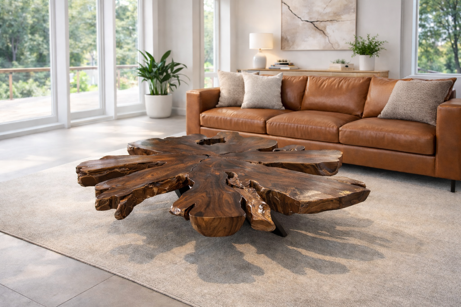 La table basse révèle toute la noblesse du bois de violette, une essence rare appréciée pour son veinage dense et ses nuances profondes. Avec ses dimensions d’environ 113 x 107 cm, elle affiche une géométrie organique qui en fait une pièce unique, idéale pour un salon haut de gamme ou un espace contemporain.