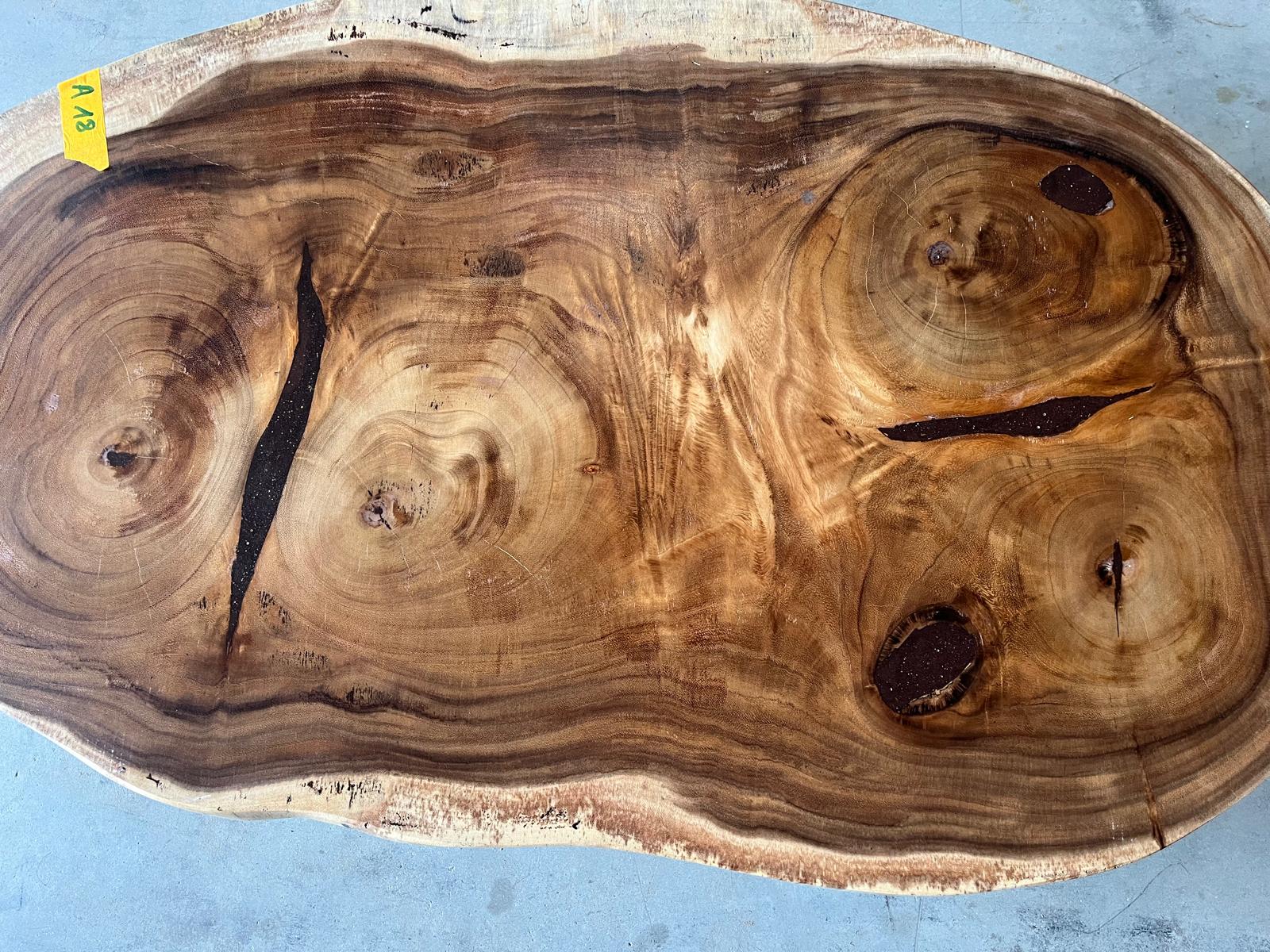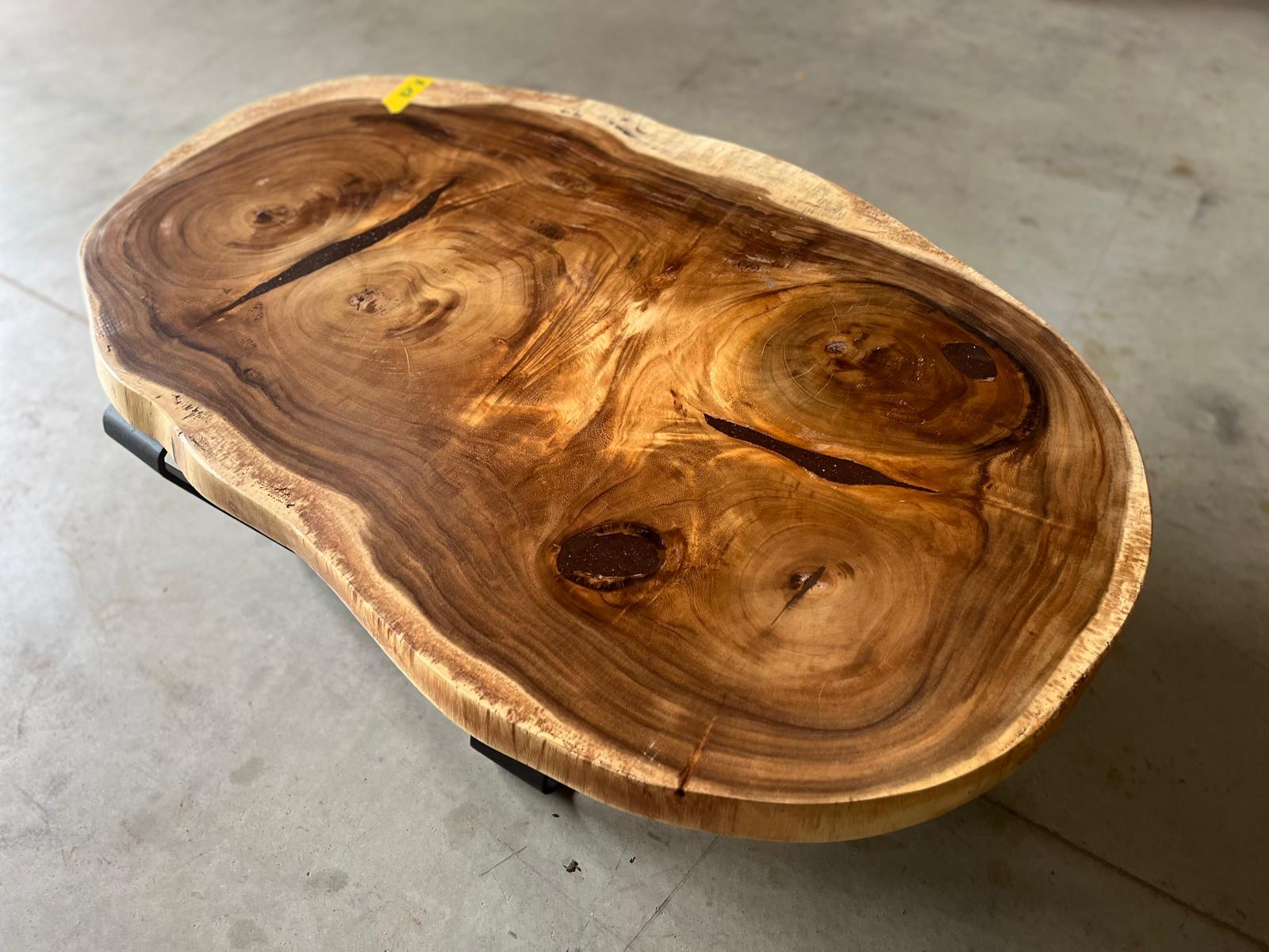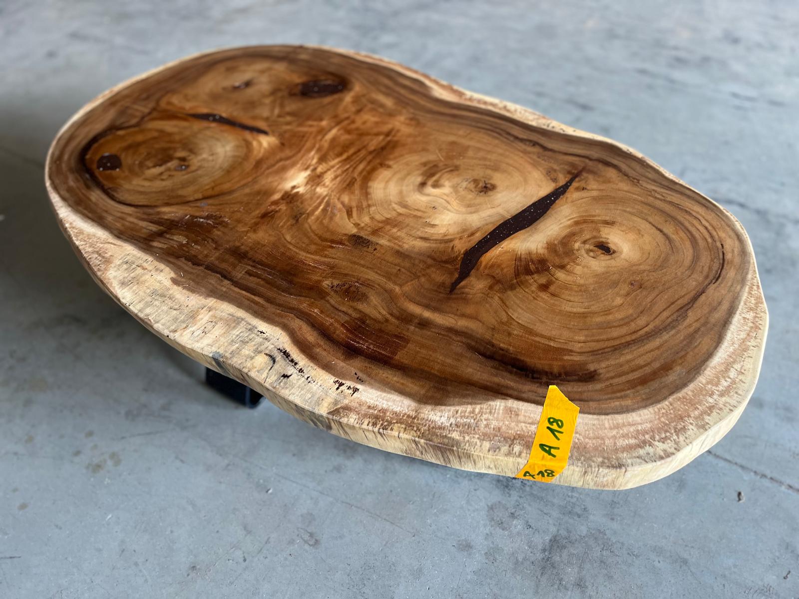 Appelé Albizia Saman, arbre de pluie, monkey pod ou rain tree en fonction des régions, le suar est un arbre formidable à plus d’un titre. L’arbre de pluie a une taille de géant, il peut atteindre une hauteur de 30 à 40 mètres, et sa cime une circonférence de 40 à 60 mètres. L’herbe est plus verte sous ce géant qu’ailleurs, car ses feuilles abritent du soleil mais se rétractent quand la luminosité baisse : elles laissent ainsi passer la pluie jusqu’au sol. C’est de là que vient son surnom d’arbre de pluie. Le suar, pour atteindre cette taille impressionnante et de par l’étendue de sa canopée, a en plus l’avantage de capter incomparablement plus de CO2 que les autres espèces. Son grain fin, le dessin sinueux de ses traits de croissance et ses beaux dégradés du blond au brun en font l’essence de bois idéale pour un plateau de table unique. On peut dire que le bois de suar déborde de vigueur et de charisme.