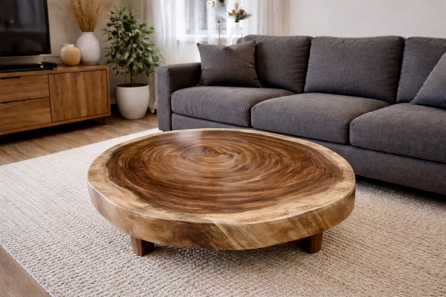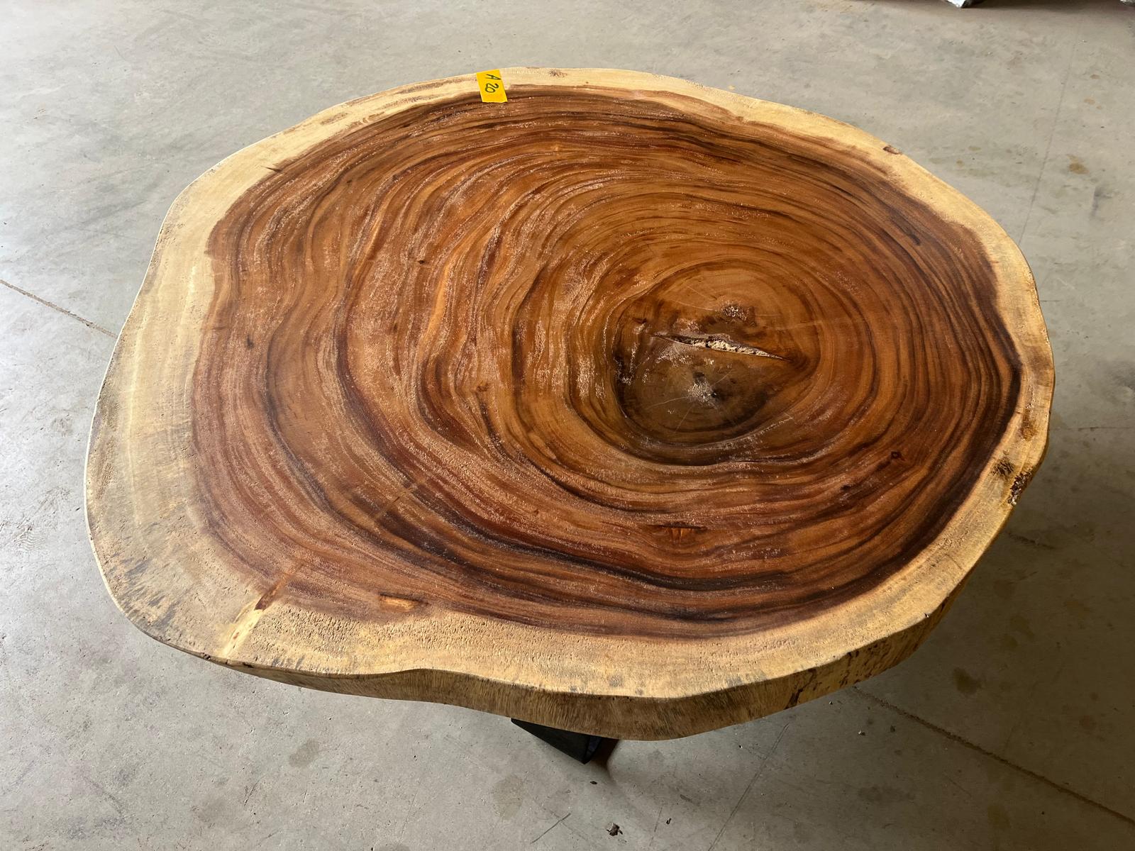 Cette table basse en suar massif séduit par son plateau circulaire parfaitement découpé dans une tranche de tronc, affichant un spectaculaire veinage concentrique. Au centre, un léger contraste et une petite cavité naturelle confèrent une authenticité brute et pleine de caractère. Ses courbes douces et son allure chaleureuse en font un véritable élément central pour un salon élégant ou un espace d’accueil unique. Le piètement en tube design diagonal noir apporte modernité et stabilité, tout en valorisant la noblesse du bois.