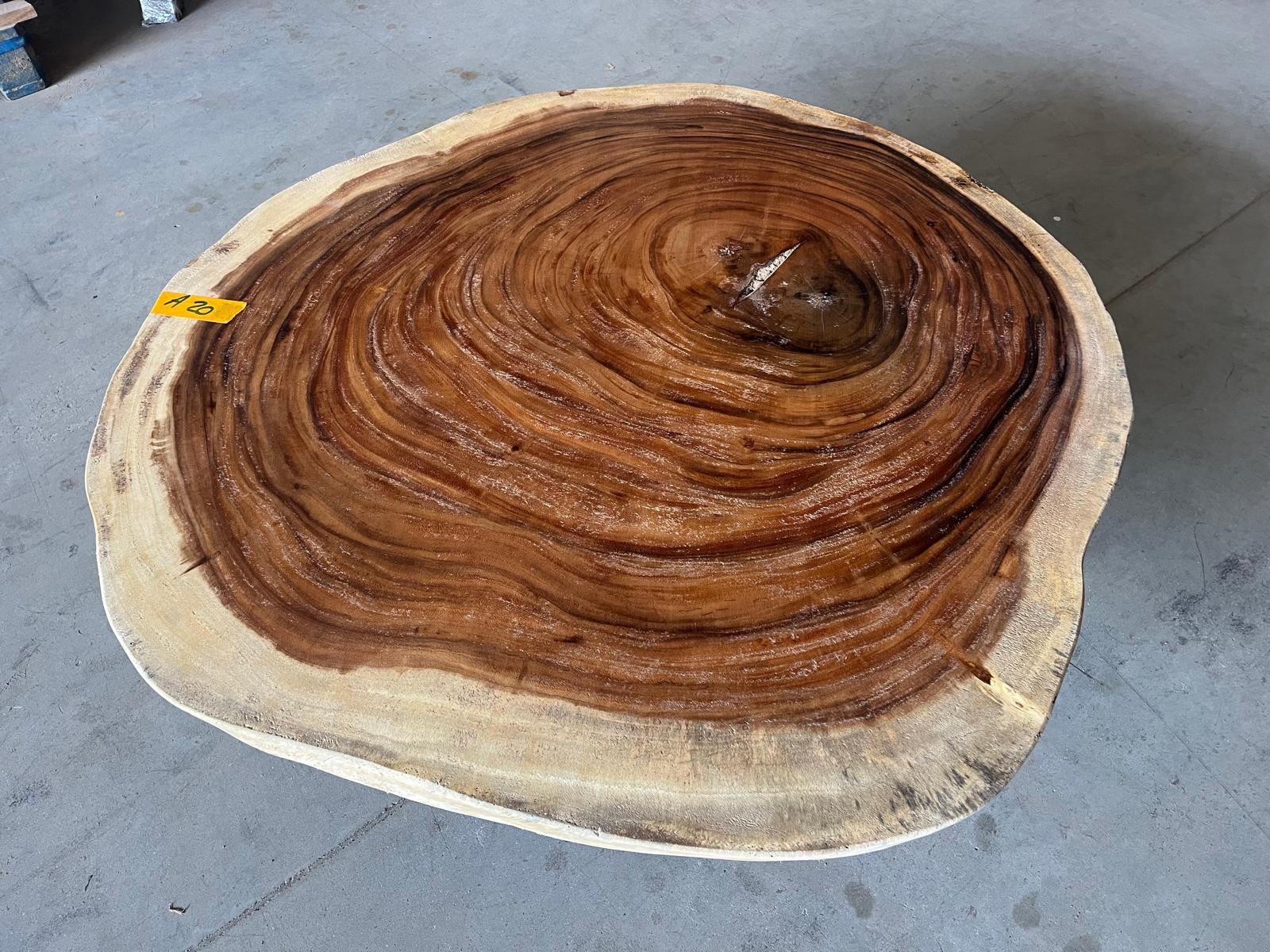 Appelé Albizia Saman, arbre de pluie, monkey pod ou rain tree en fonction des régions, le suar est un arbre formidable à plus d’un titre. L’arbre de pluie a une taille de géant, il peut atteindre une hauteur de 30 à 40 mètres, et sa cime une circonférence de 40 à 60 mètres. L’herbe est plus verte sous ce géant qu’ailleurs, car ses feuilles abritent du soleil mais se rétractent quand la luminosité baisse : elles laissent ainsi passer la pluie jusqu’au sol. C’est de là que vient son surnom d’arbre de pluie. Le suar, pour atteindre cette taille impressionnante et de par l’étendue de sa canopée, a en plus l’avantage de capter incomparablement plus de CO2 que les autres espèces. Son grain fin, le dessin sinueux de ses traits de croissance et ses beaux dégradés du blond au brun en font l’essence de bois idéale pour un plateau de table unique. On peut dire que le bois de suar déborde de vigueur et de charisme.