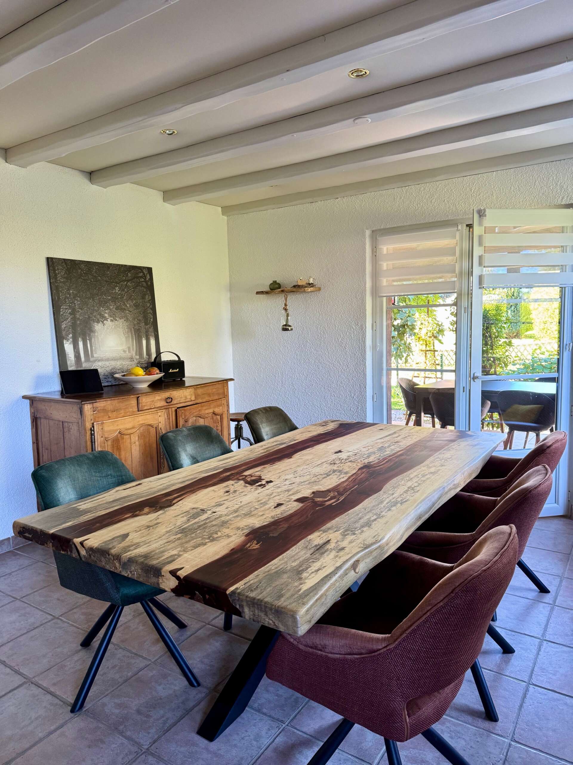 Avec ses dimensions généreuses de 250 x 110 cm, cette table à manger sur mesure offre une surface conviviale, idéale pour accueillir de grandes tablées tout en affirmant sa présence dans l’espace.