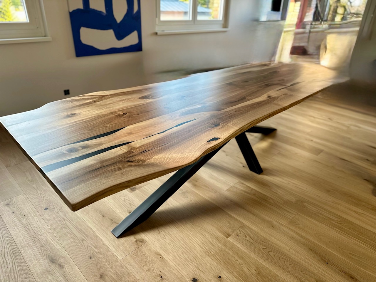 Les chants naturels ont été volontairement conservés afin de préserver l’aspect brut et authentique du bois massif. Les imperfections naturelles ont été rebouchées à l’aide d’une résine époxy teintée fumée noire, apportant caractère, contraste et renfort structurel.