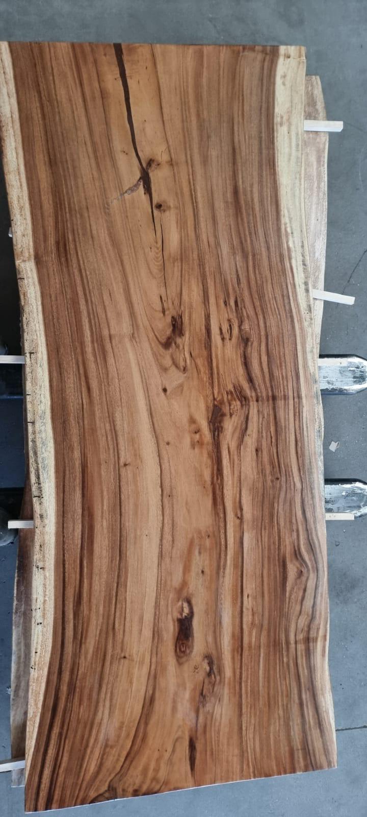 Le plateau en suar massif, aux chants naturels conservés, révèle toute la richesse de ce bois exotique et son caractère vivant. Avec ses dimensions généreuses de 220 x 100 cm, la table offre un confort d’usage idéal pour recevoir famille et amis.