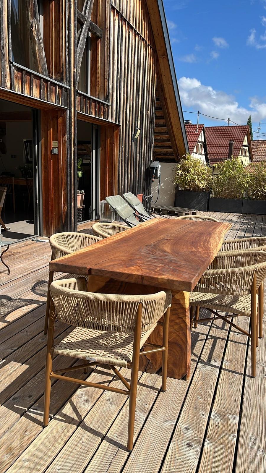 Chez Mazawood, le mobilier d’extérieur est pensé avec la même exigence que le mobilier d’intérieur. Pour ce projet, nous avons réalisé un ensemble table et deux bancs en suar massif, conçu pour créer un espace chaleureux et convivial, idéal pour les repas en plein air et les moments partagés.